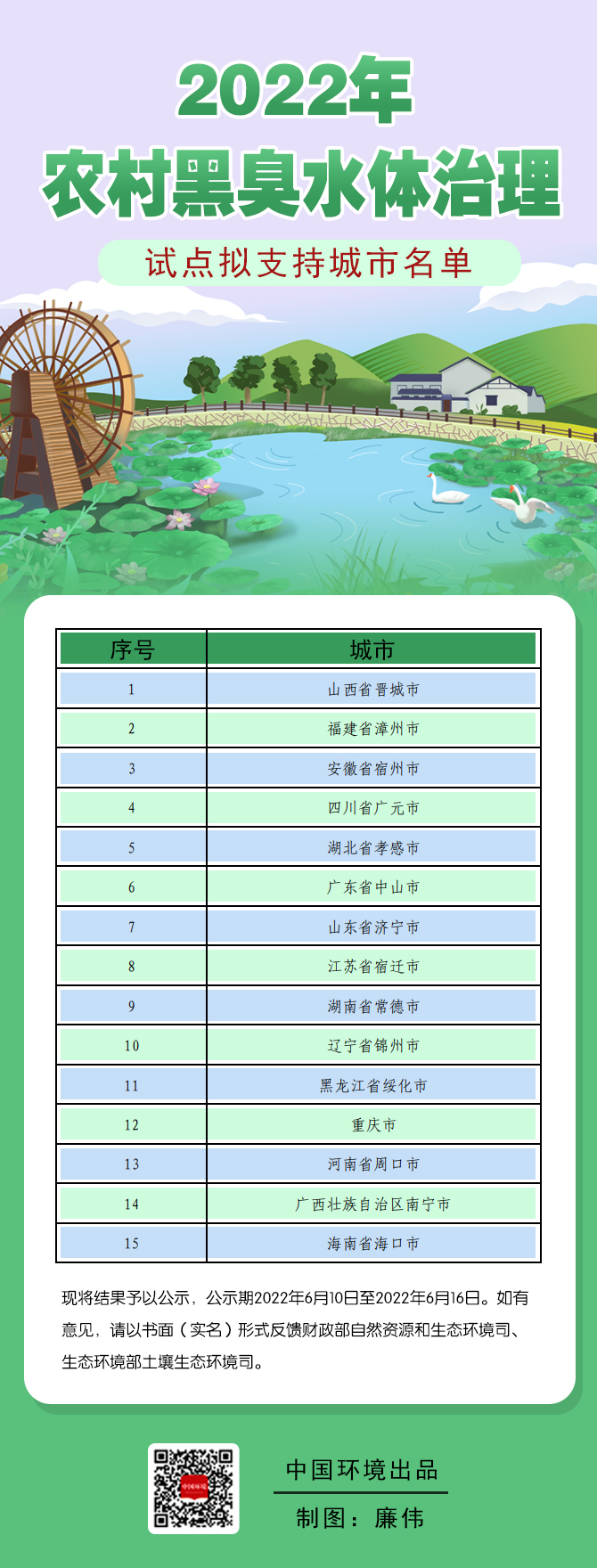 根據(jù)競爭性評審結果,財政部、生態(tài)環(huán)境部擬將15個城市確定為2022年支持的農(nóng)村黑臭水體治理試點城市,2022年6月10日至2022年6月16日為公示期。期間如有意見,請以書面(實名)形式反饋財政部自然資源和生態(tài)環(huán)境司、生態(tài)環(huán)境部土壤生態(tài)環(huán)境司。