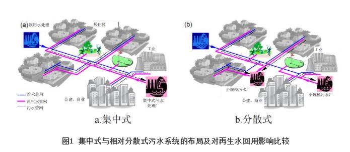 ①集中建設(shè)大規(guī)模污水處理系統(tǒng)具有較大的系統(tǒng)風(fēng)險(xiǎn)性,適度分散的污水處理系統(tǒng)不但提升了整個(gè)城市的排水系統(tǒng)總體韌性與可靠性,同時(shí)也有利于高品質(zhì)再生水作為城市第二水源的就地短距離回用,也減少了污水收集管網(wǎng)多次提升及截污干管的工程量,避免了再生水遠(yuǎn)距離泵送導(dǎo)致的巨量投資及運(yùn)行的高能耗。集中式與相對分散式污水系統(tǒng)的布局及對再生水回用影響比較見圖1。