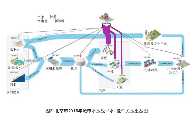 圖2所示給出了北京2015年水系統(tǒng)水量與能耗分配關(guān)系桑基圖,可以評估城市“水足跡”過程及能量消耗,在城市尺度上系統(tǒng)評估和多目標(biāo)優(yōu)化“水-能”關(guān)系,通過水系統(tǒng)全流程過程系統(tǒng)規(guī)劃、聚焦水循環(huán)每個(gè)鏈條,進(jìn)行傳統(tǒng)工藝改進(jìn)、高效設(shè)備及革新性工藝技術(shù)應(yīng)用,尤其是對排水系統(tǒng)結(jié)構(gòu)優(yōu)化進(jìn)而提升系統(tǒng)能源利用效率,因地制宜地采用污水中資源、能量回收以及清潔能源提取和利用等技術(shù)措施,進(jìn)一步降低水系統(tǒng)能耗和溫室氣體排放,對于提升水系統(tǒng)韌性及可持續(xù)至關(guān)重要。