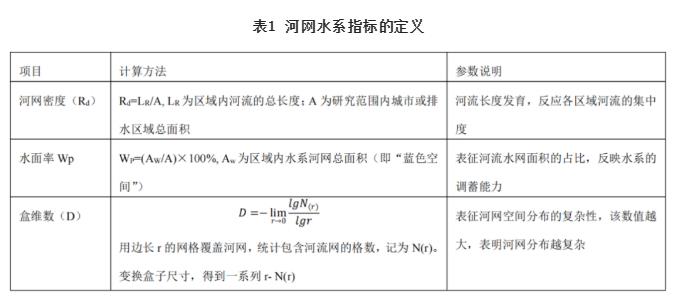 河網(wǎng)調(diào)蓄能力是水系在水文方面的重要功能之一,尤其在削減洪峰、降低洪水危害中具有重要的作用。受人類活動(dòng)影響,尤其是近半個(gè)世紀(jì)年以來快速城鎮(zhèn)化引起的土地利用方式變化,致使許多城區(qū)河流、水塘、水淀區(qū)被掩埋甚至完全消失,導(dǎo)致城市水面率大幅減少,河網(wǎng)、水系發(fā)育及演變也表現(xiàn)出由復(fù)雜到簡單、由多元到單一的變化趨勢。世界范圍內(nèi)60%以上的河流受到城市化的影響,而城市化對河流生態(tài)完整性及生態(tài)功能造成了嚴(yán)重威脅;從國內(nèi)外經(jīng)驗(yàn)看,這種演變無疑還會(huì)加劇洪澇災(zāi)害、水質(zhì)惡化等問題。借助河道容蓄指標(biāo)與水系結(jié)構(gòu)參數(shù)的相關(guān)關(guān)系分析河網(wǎng)結(jié)構(gòu)對調(diào)蓄能力的影響,常用的水系變化指標(biāo)包括數(shù)量特征參數(shù)和復(fù)雜性參數(shù),選取河網(wǎng)密度(Rd)、水面率(WP)描述水系的數(shù)量特征,河網(wǎng)盒維數(shù)描述水系的復(fù)雜性特征,各指標(biāo)計(jì)算方法及內(nèi)涵見表1。