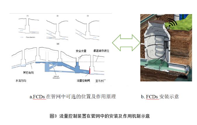 國外的研究和實(shí)際案例表明,基于整個(gè)排水系統(tǒng)的拓?fù)浣Y(jié)構(gòu),結(jié)合管網(wǎng)水力模擬等手段,選擇在管網(wǎng)關(guān)鍵節(jié)點(diǎn)處設(shè)置流量控制設(shè)備,通過布局策略、具體安裝數(shù)量和位置優(yōu)化,可以實(shí)現(xiàn)雨季對管網(wǎng)在線調(diào)蓄能力的充分利用,并實(shí)時(shí)減少CSO及下游管網(wǎng)的流量壓力,見圖3。我國室外排水設(shè)計(jì)標(biāo)準(zhǔn)缺少在城鎮(zhèn)排水管網(wǎng)適當(dāng)位置設(shè)置流量控制調(diào)節(jié)設(shè)施、設(shè)備等方面的具體技術(shù)要求或建議,因此,實(shí)際項(xiàng)目設(shè)計(jì)往往沒有考慮對排水系統(tǒng)流量主動(dòng)控制與優(yōu)化分配的必要性,導(dǎo)致暴雨期間無法實(shí)現(xiàn)對整個(gè)排水管網(wǎng)不同位置或區(qū)域的下泄流量和流速的有效控制,以及短時(shí)下游管網(wǎng)承受來自上游管網(wǎng)超量的流量沖擊進(jìn)而使得下游排水區(qū)域的排水不暢、內(nèi)澇及CSO等現(xiàn)象,甚至在管網(wǎng)薄弱環(huán)節(jié)出現(xiàn)突發(fā)性的滿溢和洪澇災(zāi)害;同時(shí),由于管網(wǎng)中缺乏FCDs,不能充分發(fā)揮管網(wǎng)應(yīng)有的在線調(diào)蓄能力,對末端流量控制易造成瞬時(shí)沖擊和壓力。實(shí)際上,分布式的流量控制設(shè)備相對大規(guī)模灰色基礎(chǔ)設(shè)施建設(shè)更加經(jīng)濟(jì)、易于實(shí)施、可持續(xù),因此,改進(jìn)傳統(tǒng)排水管網(wǎng)被動(dòng)接收的排水模式,通過設(shè)置必要的在線流量控制裝置實(shí)現(xiàn)排水系統(tǒng)峰值流量管控,向“空間”換“時(shí)間”的主動(dòng)控制方向轉(zhuǎn)變,對于增加汛期排洪防澇的靈活性、提升排水系統(tǒng)韌性和可靠性等方面至關(guān)重要。