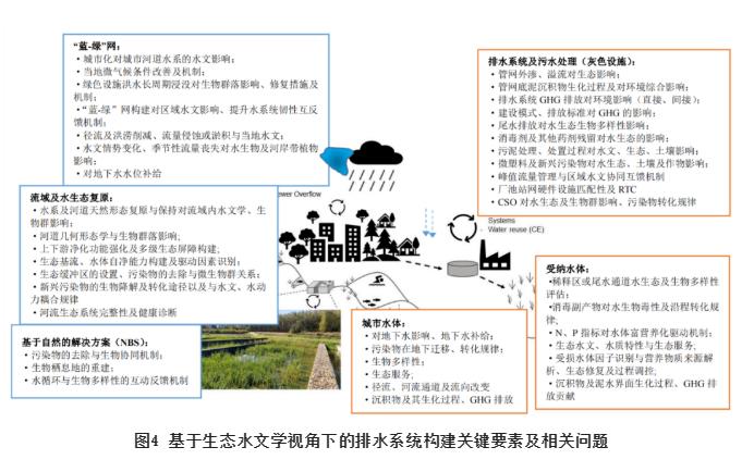 傳統(tǒng)城市排水系統(tǒng)的規(guī)劃、設(shè)計(jì)與實(shí)施環(huán)節(jié)可歸結(jié)為“水量”和“水質(zhì)”兩個(gè)維度,缺乏跨學(xué)科性且統(tǒng)籌不足,因此在規(guī)劃設(shè)計(jì)中融入生態(tài)水文措施可以彌補(bǔ)傳統(tǒng)排水設(shè)施的剛性缺欠。近年來,在“海綿城市”理念引領(lǐng)下,一些基于自然的解決方案(Nature-based solutions ,NBS) 得到應(yīng)用。盡管NBS是為特定目的而設(shè)計(jì)的(如城市排水),但它可以同時(shí)提供多種生態(tài)系統(tǒng)服務(wù),如雨水自然處理和滲濾、蒸發(fā)和生物多樣性保持等。通過對近些年的一些實(shí)踐案例調(diào)研發(fā)現(xiàn),個(gè)別具有“生態(tài)”特征的綠色基礎(chǔ)設(shè)施項(xiàng)目,從“現(xiàn)代生態(tài)水文學(xué)”角度來評價(jià),則會(huì)發(fā)現(xiàn)其在城市水文、生物多樣性及水生態(tài)服務(wù)等維度上缺乏系統(tǒng)性統(tǒng)籌,因此,應(yīng)從排水系統(tǒng)或者全域水資源系統(tǒng)管理角度,充分考慮水的社會(huì)循環(huán)擾動(dòng)對自然水文及生物多樣性的影響。城市級流域尺度上水系統(tǒng)不同要素之間的關(guān)聯(lián)及相互作用關(guān)系見圖4。