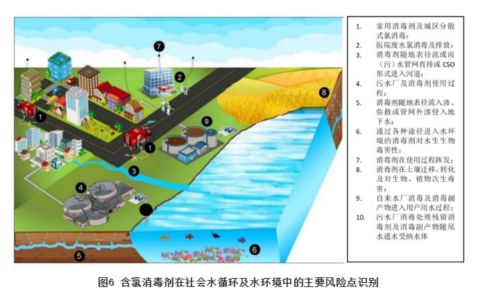 近些年來,隨著各地污水排放標(biāo)準(zhǔn)對糞大腸桿菌群指標(biāo)要求的提高,污水處理過程中往往會(huì)過量投加含氯消毒劑,可能導(dǎo)致污水生物毒性顯著增強(qiáng)的問題,這是因?yàn)橄緞┠軌蚺c水中含有的人工或天然溶解性有機(jī)物(NOM)發(fā)生氯化反應(yīng)生成大量鹵代消毒副產(chǎn)物(HDBPs)并排放到受納水體。此外,不同于給水水源,污水廠尾水殘留較高濃度的含氮素有機(jī)物發(fā)生氯化反應(yīng)后還會(huì)產(chǎn)生含氮的HDBPs,如鹵乙腈、鹵硝基甲烷和N-亞硝基二甲胺(NDMA)等具有更強(qiáng)三致活性的物質(zhì);污水中溴化物濃度通常也遠(yuǎn)高于飲用水水源,因此尾水消毒過程也會(huì)產(chǎn)生大量具有更高“三致” 活性的溴代DBPs;同時(shí),因過量投加生成的部分消毒劑及其水解產(chǎn)物也會(huì)隨尾水排放到受納水體,不同種類的DBPs可以在排放口下游河道數(shù)km~數(shù)十km范圍內(nèi)被檢測到,甚至三鹵甲烷沿程在一定區(qū)間內(nèi)沿程濃度呈現(xiàn)逐漸提高趨勢。顯然,長距離、長周期的各類DBPs和殘留消毒劑的存在,會(huì)持續(xù)破壞水環(huán)境功能及微生物菌群結(jié)構(gòu),并對水生生物(魚類、貝類等)產(chǎn)生急性、亞急性毒性效應(yīng),對水生植物產(chǎn)生直接破壞作用,進(jìn)而持續(xù)破壞水生生態(tài)系統(tǒng)平衡,導(dǎo)致微生物生態(tài)系統(tǒng)結(jié)構(gòu)性及功能性改變,受納水體及下游水環(huán)境生物多樣性消失。倘若這些含有DBPs“毒性”增強(qiáng)的尾水被直接或間接排放到飲用水水源,其對飲用水水源地水質(zhì)安全性直接構(gòu)成嚴(yán)重威脅(氯化消毒及產(chǎn)物足跡與歸宿見圖6)。近些年來,據(jù)調(diào)研,我國一些執(zhí)行高排放標(biāo)準(zhǔn)的污水項(xiàng)目,其尾水排放河道及水環(huán)境生物多樣性反而比提標(biāo)前大幅減少甚至魚蝦皆無,這種高藥耗、高能耗換取的所謂“高品質(zhì)水”其生態(tài)價(jià)值值得深入探究。
