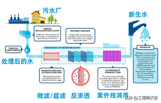 新加坡的新生水在2002年發布,新加坡一直引以為豪,這類把污水再循環利用的水,主要運用于必須超凈化水的工業生產,及其引入貯水池彌補水利樞紐等。新加坡當地現階段配有五座新生自來水廠,每日生產制造近80萬立方的新生水。預估到2060年,新生水將達到新加坡全國各地總耗水量的55%。