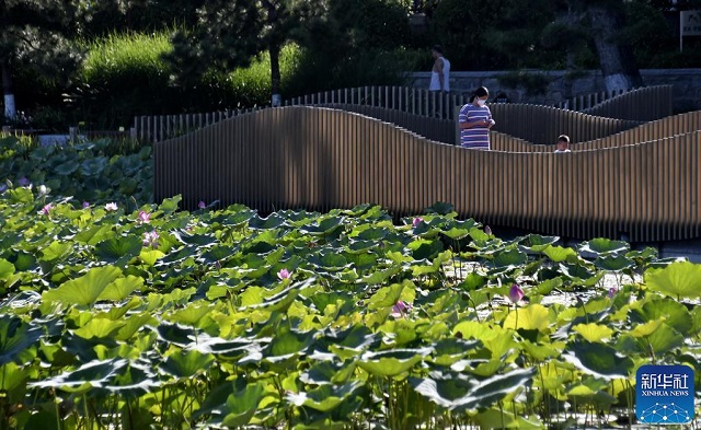 9月5日,市民在龍?zhí)段骱闲蓍e。龍?zhí)段骱仔陆艘蛔側(cè)莘e9萬(wàn)立方米的調(diào)蓄池,通過(guò)硅砂蜂巢調(diào)蓄凈化系統(tǒng)對(duì)來(lái)水水質(zhì)進(jìn)行處理。