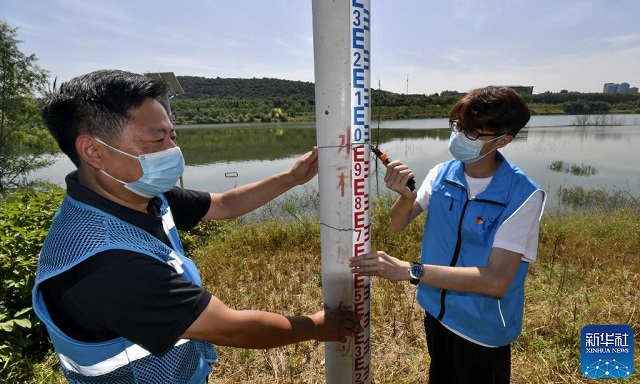 9月8日,管護(hù)人員在檢查阜石路西郊雨洪調(diào)蓄工程的水位測(cè)量設(shè)備。