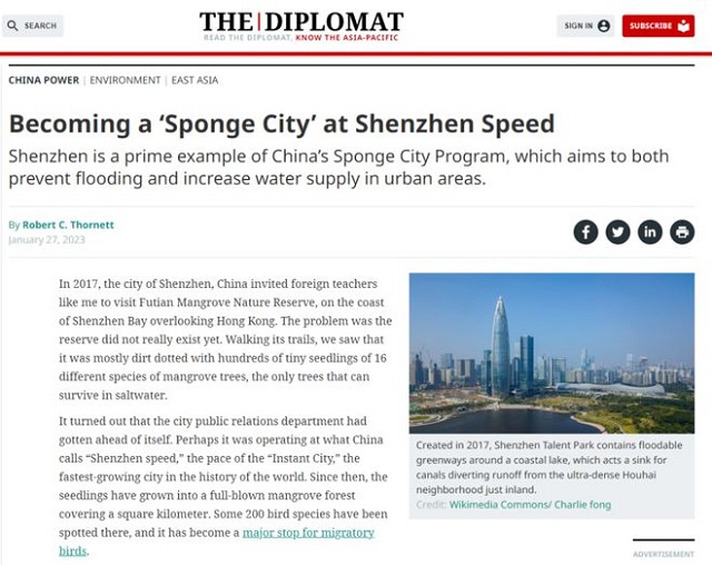 近日,國際知名的“外交學(xué)者”網(wǎng)站(The Diplomat )發(fā)表了一篇文章——《以深圳速度成為“海綿城市”》(Becoming a ‘Sponge City’ at Shenzhen Speed),關(guān)注中國海綿城市建設(shè)。該報(bào)道出自一位美國作家、高校講師羅伯特·索尼特(Robert C. Thornett)之手。作者曾經(jīng)到訪深圳參觀過福田紅樹林自然保護(hù)區(qū),作者也從多個具體的例子切入講述海綿城市在深圳的具體實(shí)踐。