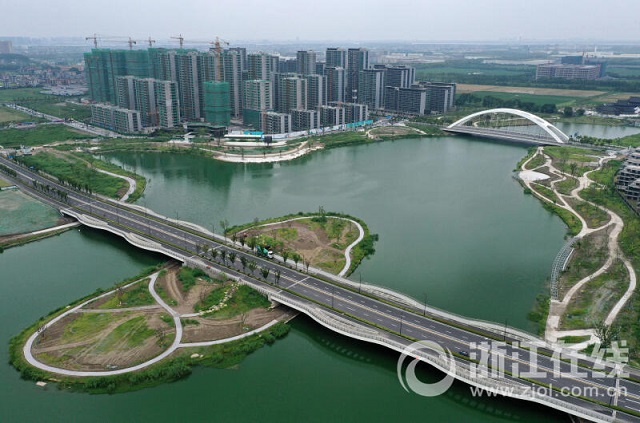 近年來,杭州進(jìn)一步加大海綿城市建設(shè)力度。本組圖片為8月15日記者用無人機(jī)鳥瞰杭州錢塘區(qū)東湖防洪調(diào)蓄湖配套工程一期,其北岸的濱水空間“樣板段”已基本完工。該項目水域面積約34.5萬平方米,陸域面積約29.72萬平方米,涵蓋綠地面積約21.8萬平方米。公園以生態(tài)建設(shè)為核心,用多種植物打造水上森林、浩瀚蘆葦灘等特色景觀,延續(xù)生態(tài)野趣的濕地風(fēng)貌,具備水質(zhì)涵養(yǎng)及氣候調(diào)節(jié)等生態(tài)功能。