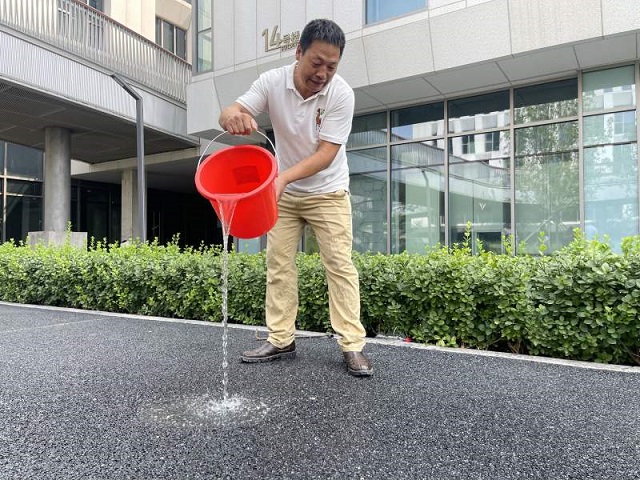 近年來,透水磚、滲水路面得到廣泛使用,在石景山保險產(chǎn)業(yè)園也同樣如此。園區(qū)暖通工程師那會義向記者展示了路面滲水試驗。那會義拎來一大桶水, 沖著路面倒了下去。記者看到,雖然水流流速很快,但路面就像干燥的海綿,可以把水快速吸干,一點兒積水都沒有。