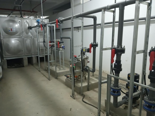 建筑內,也“別有洞天”——設置雨水回收系統(tǒng),收集屋面及道路雨水后,采用“就地預處理單元+生化處理系統(tǒng)”工藝將凈化后的雨水輸送到清水箱中,用于場地內綠化的澆灌,以“水循環(huán)”實現水資源高效利用。