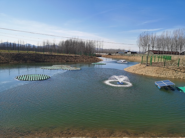 在泗水縣青龍莊村南側(cè),有一處自然坑塘,水體顏色異常且透明度低于20CM,經(jīng)排查確認(rèn)為農(nóng)村黑臭水體。當(dāng)?shù)赝度?6萬元,采取排除污水、清除底泥、草皮護(hù)坡、清理坑塘周邊垃圾等措施,治理坑塘面積約4300平方米,汛期可集蓄1.2萬余方雨水,為周邊農(nóng)田提供9000余方灌溉水源。此外,還在水面安裝了太陽能曝氣機(jī)及生態(tài)浮島,維持水體凈化能力。