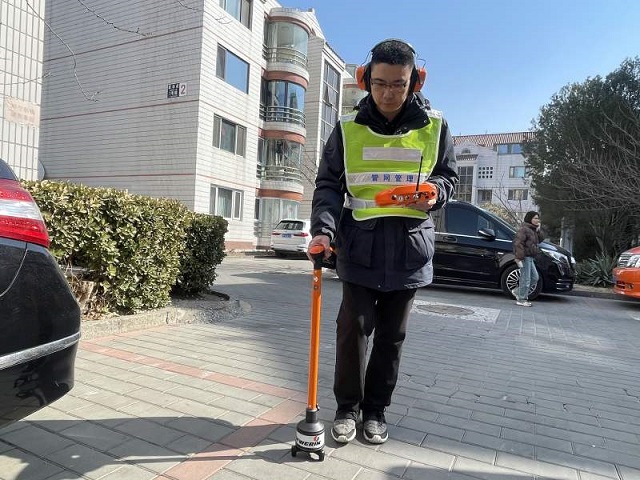 聽漏儀是一根長長的“聽筒”,如同靈敏的“順風耳”,工作人員戴上耳機,將“聽筒”貼向地面,每邁一步便挪動一次聽漏儀的位置,就這樣一點點探查管道的“健康”狀況。