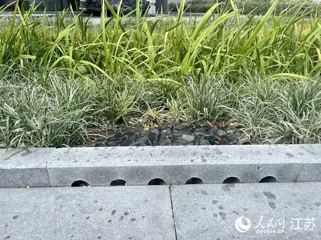 一處雨水花園內(nèi),圍住花園的路緣石上,開了6個圓孔??此破胀ǖ脑O計,卻可以使雨水快速導入花園中,這是讓“海綿”吸飽水的第一步。