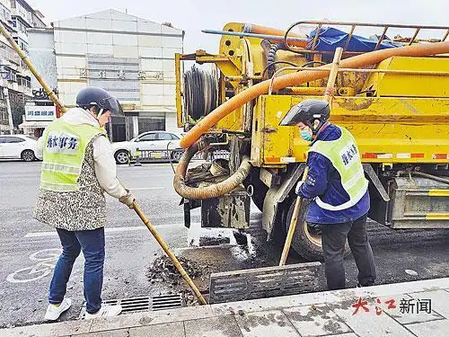 在迎賓北大道上,工人則用上了吸污車等設備。只見在高壓水槍的沖洗下,淤泥和雜物等都從管道內涌出,幾分鐘內便被工人清理完畢。“我中心主要對管轄的41條道路的雨水管網、雨水井和易堵點等進行全覆蓋清掏和疏通,確保雨水管網無淤泥堆積、排水設施正常運行,從而提高雨水管涵的排水速度。”南昌市排水事務中心管網一所副所長萬強介紹,雨水井內淤泥一般采用人工清掏,管道內淤泥則用高壓水槍沖洗。在清掏的同時,還會檢查管道是否存在堵塞情況,如發現堵塞便會使用吸污車疏通,做到及時發現、及時處理。