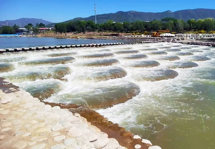 在蓮石湖跌水修復施工現場,河道岸坡已被修葺一新,湖中央設計的三級圍堰跌水結構,通過高低落差的層次感減緩上游水流流速。而在門城湖的魚鱗跌水,則是通過階梯式的魚鱗結構實現水流消能。