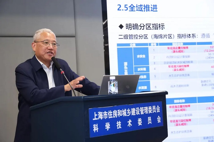 海綿城市建設是城市尺度的系統(tǒng)工程,需要多專業(yè)協(xié)同。全國工程勘察設計大師、海綿城市建設工程技術創(chuàng)新中心主任張辰在會上首先系統(tǒng)闡述了全域海綿城市建設的技術邏輯、實施路徑與長效機制。在介紹上?!笆奈濉焙>d城市建設取得的顯著成效時,他詳細解讀了2030年新增450平方公里達標區(qū)等目標規(guī)劃,以及四類管控分區(qū)的差異化指標制定,并分享了通過源頭減排、過程控制、系統(tǒng)治理全鏈條推進的多個海綿改造實例,為超大城市海綿城市建設提供了權威技術示范。
